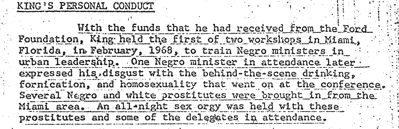 In a declassified FBI document titled “Martin Luther King Jr., A Current Analysis”, the agents claim that Dr. King hosted “an all night sex orgy” with “prostitutes and some delegates in attendance” at a workshop that was supposedly meant to train “negro ministers in urban leadership.” Yeah, you read that right. That workshop.